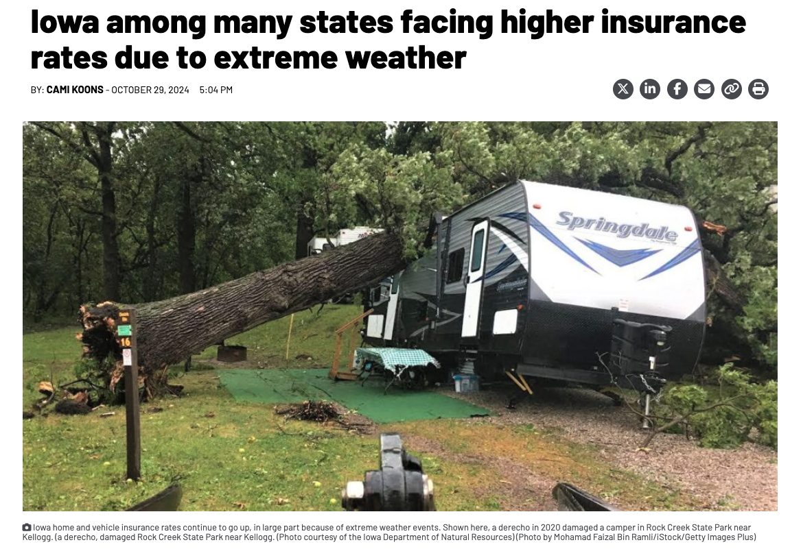 ‘Mounting insurance crisis’ in Iowa: A new report shows Iowa homeowners had an average premium increase of 14% last year, and increasingly severe weather (like the derecho) has a lot to do with it.